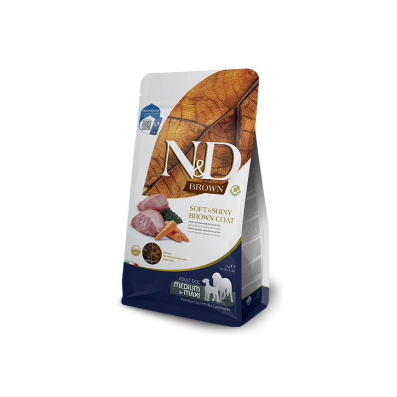 Farmina N&D Brown me Qengj, Spirulina e Karota eshte nje ushqim i plote per qen adult Medium/Maxi.