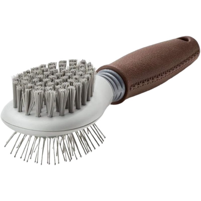 Kombinim furçe për qen, njërën anë me qime të buta, anën tjetër me gozhda nikeluese, me qafë fleksibël dhe dorezë ergonomike. Përshtatet për qime të shkurtra, mesatare apo të gjata.